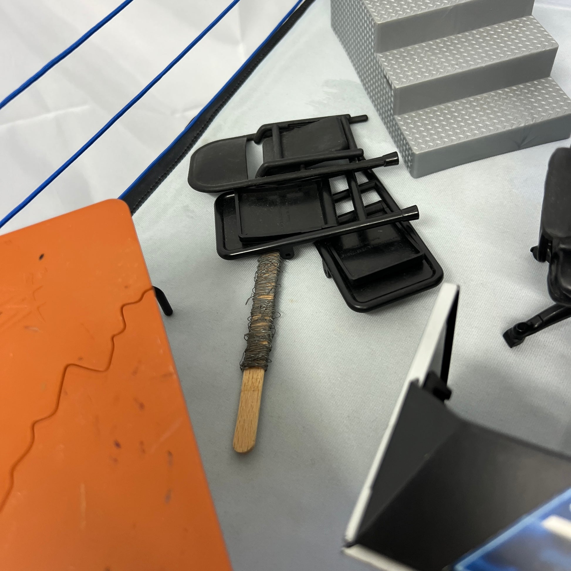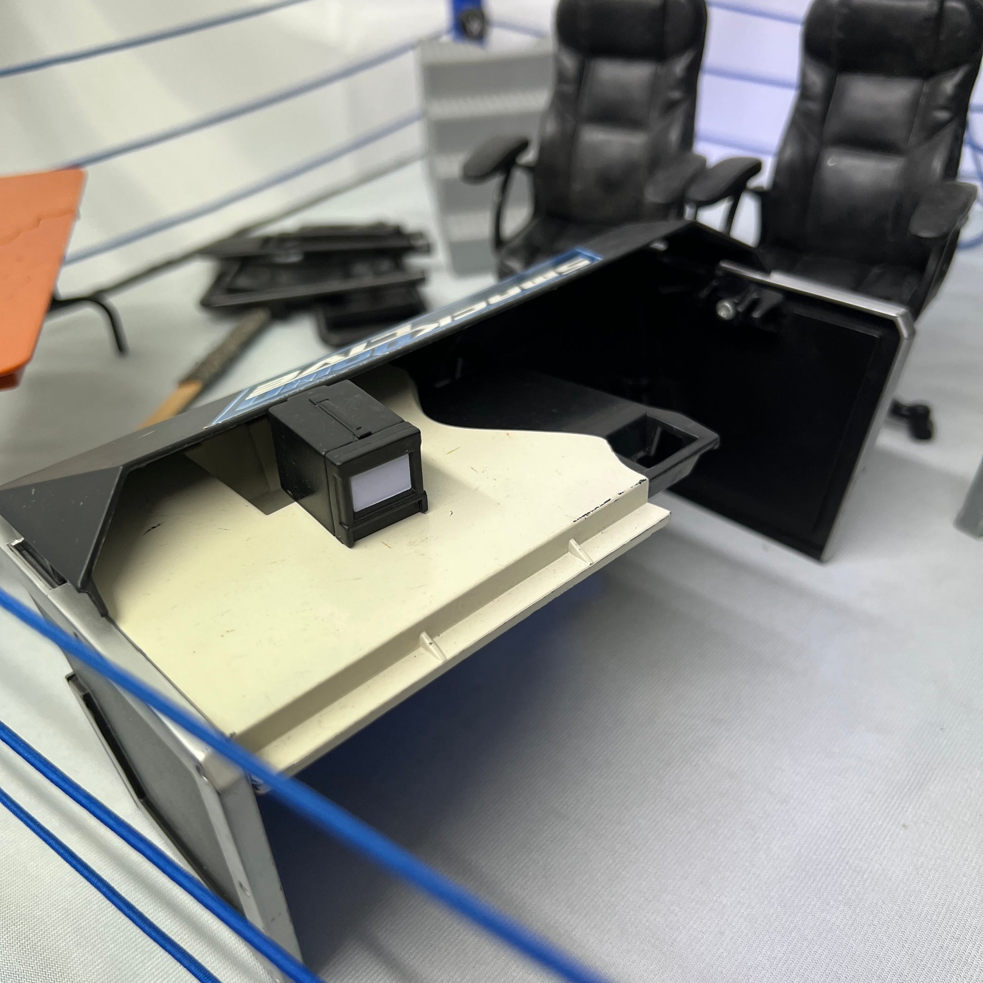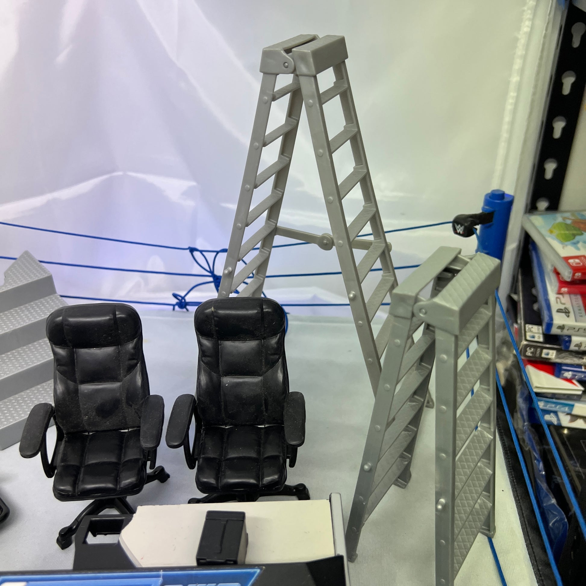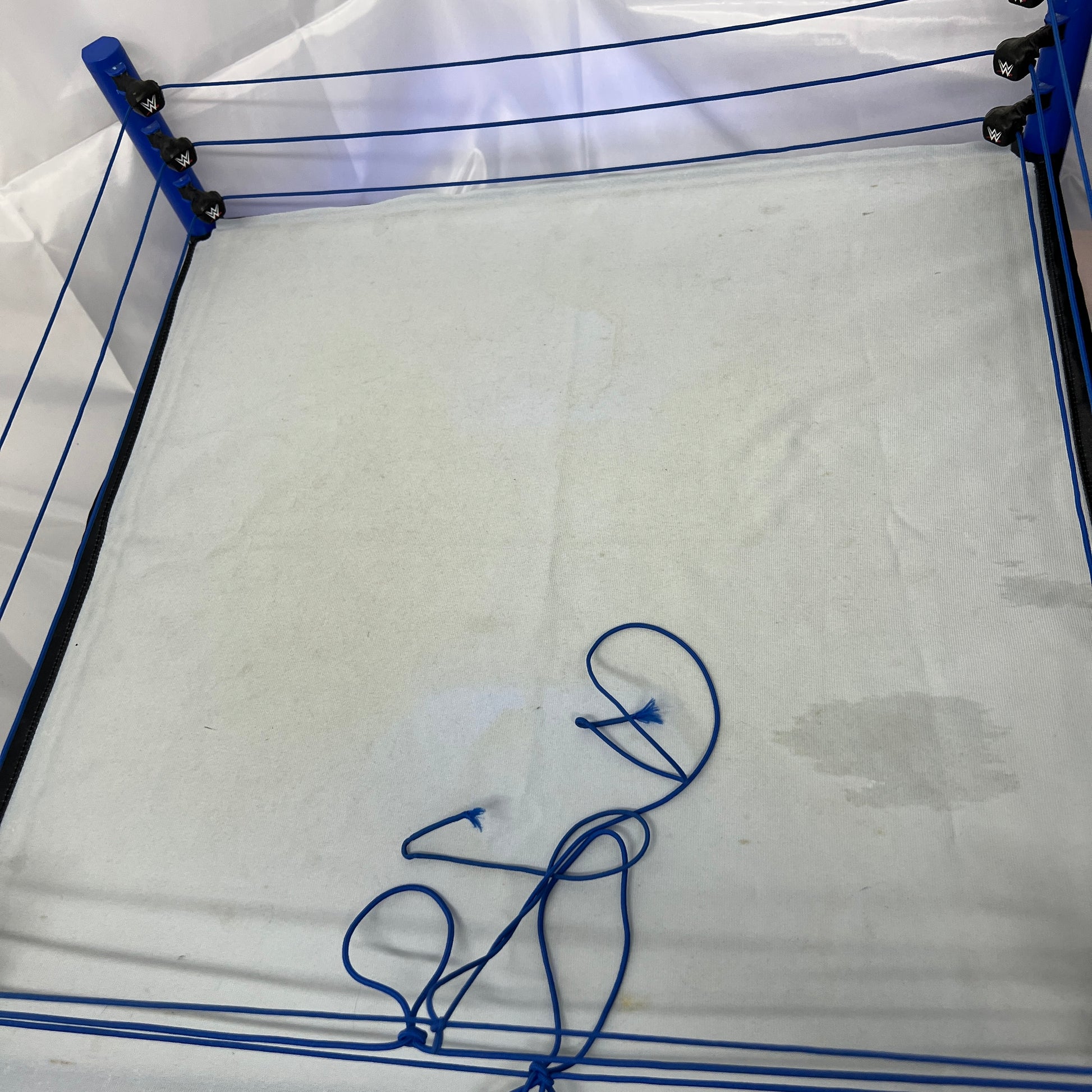 Please note - one ring post does not light up, other 3 do. Commentator table missing half of the middle of it. All accessories pictures included. Needs batteries and it lights up 3 ring posts and two banners.